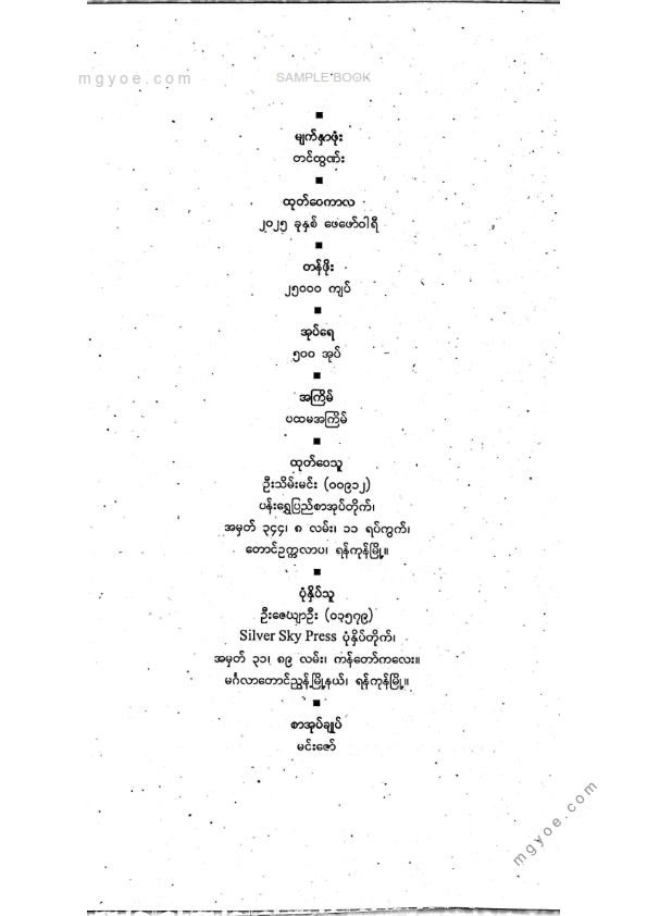 :: ဤစာအုပ်ကို စာမြည်းဖတ်လိုပါက “စာမြည်းရန်အီးဘွခ်” ဆိုသည်ကိုရွေး၍ (Buy it now) ခလုတ် ကိုနှိပ်ကာ၀ယ်ယူပေးပါ၊ အခမဲ့ အမှာစာ (Order) တင်ပြီးသည့်နောက်တွင် ၄င်းအီးဘွခ်ပီဒီအက်ဖ်ဖိုင် ဒေါင်းလုပ်ဆွဲရန်လင့်ကို စာဖတ်သူ၏ အီးမေလ်ထဲသို့ ပို့လိုက်မည်ဖြစ်ပါသည်၊