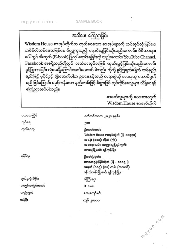 :: ဤစာအုပ်ကို စာမြည်းဖတ်လိုပါက “စာမြည်းရန်အီးဘွခ်” ဆိုသည်ကိုရွေး၍ (Buy it now) ခလုတ် ကိုနှိပ်ကာ၀ယ်ယူပေးပါ၊ အခမဲ့ အမှာစာ (Order) တင်ပြီးသည့်နောက်တွင် ၄င်းအီးဘွခ်ပီဒီအက်ဖ်ဖိုင် ဒေါင်းလုပ်ဆွဲရန်လင့်ကို စာဖတ်သူ၏ အီးမေလ်ထဲသို့ ပို့လိုက်မည်ဖြစ်ပါသည်၊