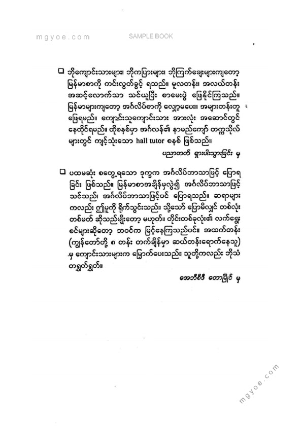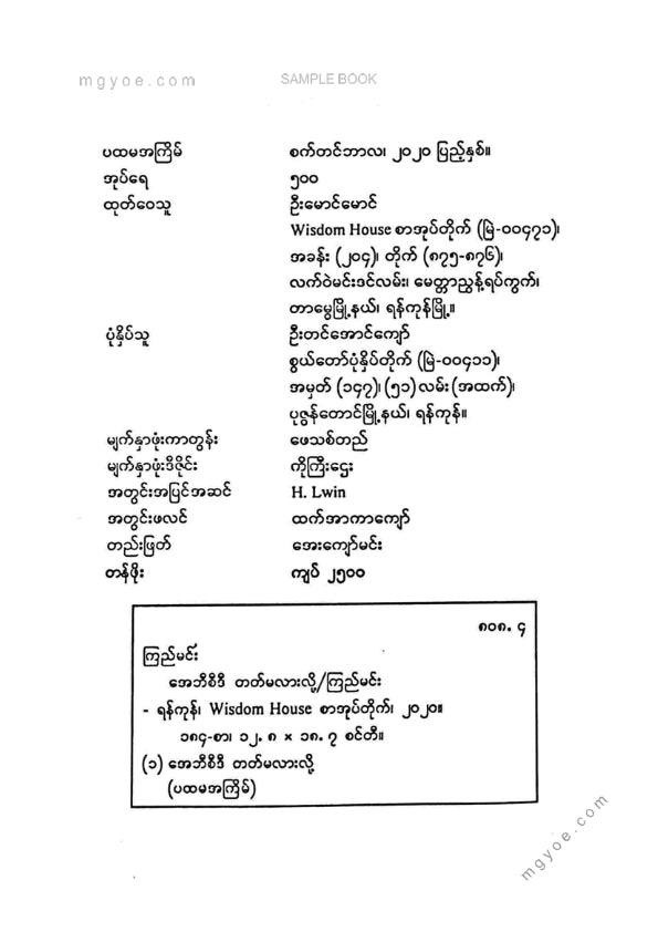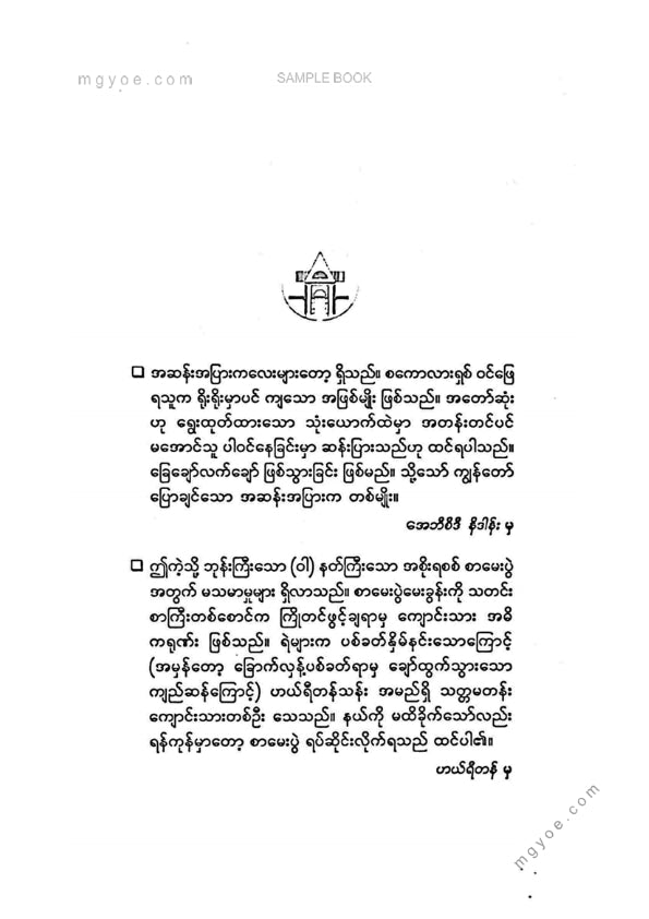 :: ဤစာအုပ်ကို စာမြည်းဖတ်လိုပါက “စာမြည်းရန်အီးဘွခ်” ဆိုသည်ကိုရွေး၍ (Buy it now) ခလုတ် ကိုနှိပ်ကာ၀ယ်ယူပေးပါ၊ အခမဲ့ အမှာစာ (Order) တင်ပြီးသည့်နောက်တွင် ၄င်းအီးဘွခ်ပီဒီအက်ဖ်ဖိုင် ဒေါင်းလုပ်ဆွဲရန်လင့်ကို စာဖတ်သူ၏ အီးမေလ်ထဲသို့ ပို့လိုက်မည်ဖြစ်ပါသည်၊