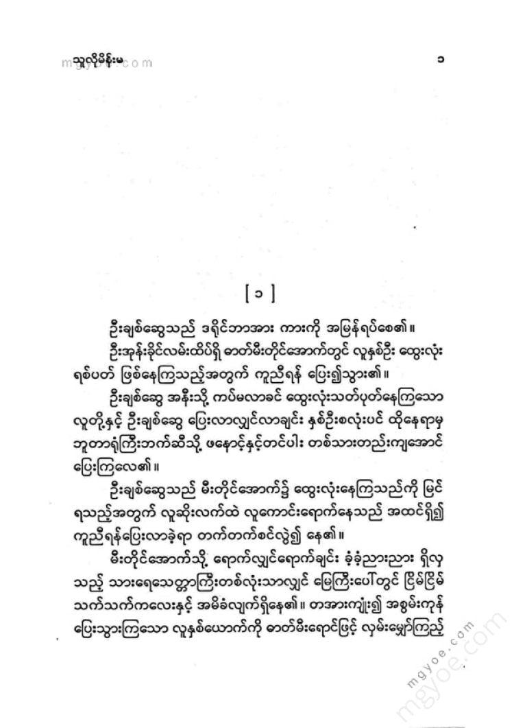 တစ်ခါဖူးမျှ အိမ်ထောင်ရေးကို တွေးမကြည့်ဖူးပေ။ အိမ်ထောင်ပြု ရန် စိတ်ကူးမထည့်သာ၌ အိမ်ထောင်ရေးကို တွေး၍ မကြည့်ခြင်း ဖြစ်လေ၏၊ အလုပ်အားချိန်တွင် ဝါသနာပါရာ စာဖတ်၍ အချိန်ကို ကုန်လွန်စေ၏။