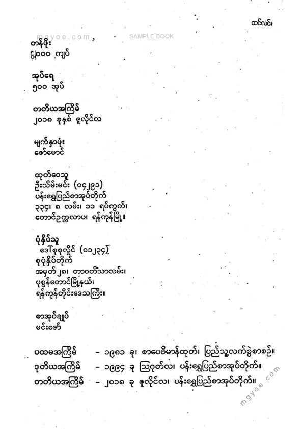 :: ဤစာအုပ်ကို စာမြည်းဖတ်လိုပါက “စာမြည်းရန်အီးဘွခ်” ဆိုသည်ကိုရွေး၍ (Buy it now) ခလုတ် ကိုနှိပ်ကာ၀ယ်ယူပေးပါ၊ အခမဲ့ အမှာစာ (Order) တင်ပြီးသည့်နောက်တွင် ၄င်းအီးဘွခ်ပီဒီအက်ဖ်ဖိုင် ဒေါင်းလုပ်ဆွဲရန်လင့်ကို စာဖတ်သူ၏ အီးမေလ်ထဲသို့ ပို့လိုက်မည်ဖြစ်ပါသည်၊