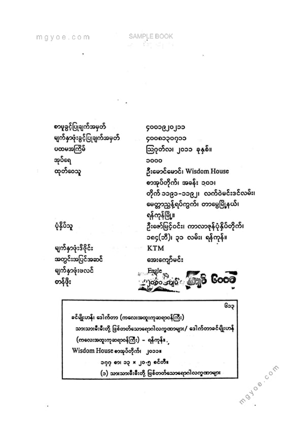 :: ဤစာအုပ်ကို စာမြည်းဖတ်လိုပါက “စာမြည်းရန်အီးဘွခ်” ဆိုသည်ကိုရွေး၍ (Buy it now) ခလုတ် ကိုနှိပ်ကာ၀ယ်ယူပေးပါ၊ အခမဲ့ အမှာစာ (Order) တင်ပြီးသည့်နောက်တွင် ၄င်းအီးဘွခ်ပီဒီအက်ဖ်ဖိုင် ဒေါင်းလုပ်ဆွဲရန်လင့်ကို စာဖတ်သူ၏ အီးမေလ်ထဲသို့ ပို့လိုက်မည်ဖြစ်ပါသည်၊
