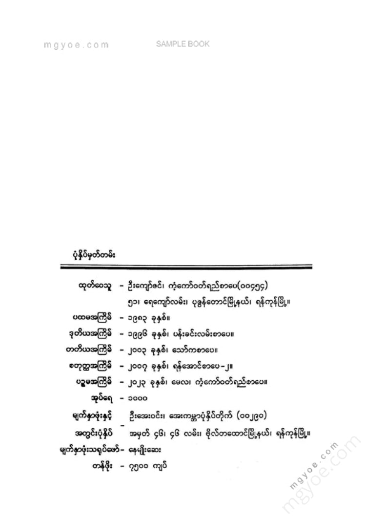 :: ဤစာအုပ်ကို စာမြည်းဖတ်လိုပါက “စာမြည်းရန်အီးဘွခ်” ဆိုသည်ကိုရွေး၍ (Buy it now) ခလုတ် ကိုနှိပ်ကာ၀ယ်ယူပေးပါ၊ အခမဲ့ အမှာစာ (Order) တင်ပြီးသည့်နောက်တွင် ၄င်းအီးဘွခ်ပီဒီအက်ဖ်ဖိုင် ဒေါင်းလုပ်ဆွဲရန်လင့်ကို စာဖတ်သူ၏ အီးမေလ်ထဲသို့ ပို့လိုက်မည်ဖြစ်ပါသည်၊