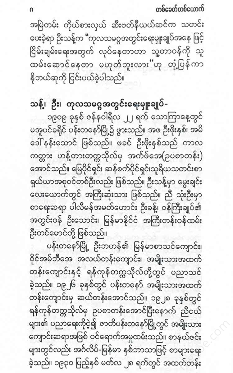 ၁၉၅၈ မှာ လာမယ့် ရွေးကောက်ပွဲအသစ်အတွက် နိုင်ငံရေးသမားတွေ အလုပ်ရှုပ်နေချိန်မှာ ကျွန်တော်က ကုလသမဂ္ဂအထွေထွေညီလာခံရဲ့ကျွမ်းကျင်သူကိုယ်စားလှယ်အဖွဲ့ဝင်တစ်ဦးဖြစ်နေခဲ့တယ်။ကုလသမဂ္ဂမှာရှိနေတုန်း တစ်ခါမှာ ကျွန်တော်ဝတ်စုံအသစ်ချုပ်ချင်တယ် ပြောမိတော့ ကျွန်တော့်သူငယ်ချင်းကိုယ်စားလှယ်အဖွဲ့ ဒုခေါင်းဆောင် ဂျင်မီပေါ်ထင်က သူ့ဆရာဦးသန့်ချုပ်နေကျ အပ်ချုပ်ဆိုင်ကို ခေါ်သွားတယ်။ အဲဒီဆိုင်က ထိပ်တန်းသံတမန်တွေလာအပ်လေ့ရှိတဲ့ပဉ္စမရိပ်သာလမ်းကအဆင့်မြင့်ဖက်ရှင်ဆိုင်ပဲ။ဘဏ်လုပ်ငန်းရှင်တွေအပ်တဲ့ဆိုင်မျိုးထက်တောင် သာသေး တယ်။ ဦးသန့် အဝတ်အစားကောင်းကို ကြိုက်တယ်ဆိုတာ ကျွန်တော်လည်း ပိုက်ဆံအိတ်နဲ့ရင်းပြီး သိလိုက်ရတယ်ပေါ့ လေ။ နောက်တစ်ချက်က သူ့ဧည့်ခံပွဲတစ်ခုကို ကျွန်တော် ရောက်တော့ သူဟာ ဧည့်သည်တစ်ဦးချင်းစီနဲ့ ဓာတ်ပုံတွဲ ရိုက်လေ့ရှိပြီး အဲဒီဓာတ်ပုံတွေလည်း ကာယကံရှင်တွေဆီကို မပျက်မကွက်ပို့ပေးတဲ့ အလေ့ရှိတယ်။ ဒါဟာ ဂျပန်တွေရဲ့ အလွန်ကောင်းတဲ့ ဓလေ့စရိုက်တစ်ခုပါ။