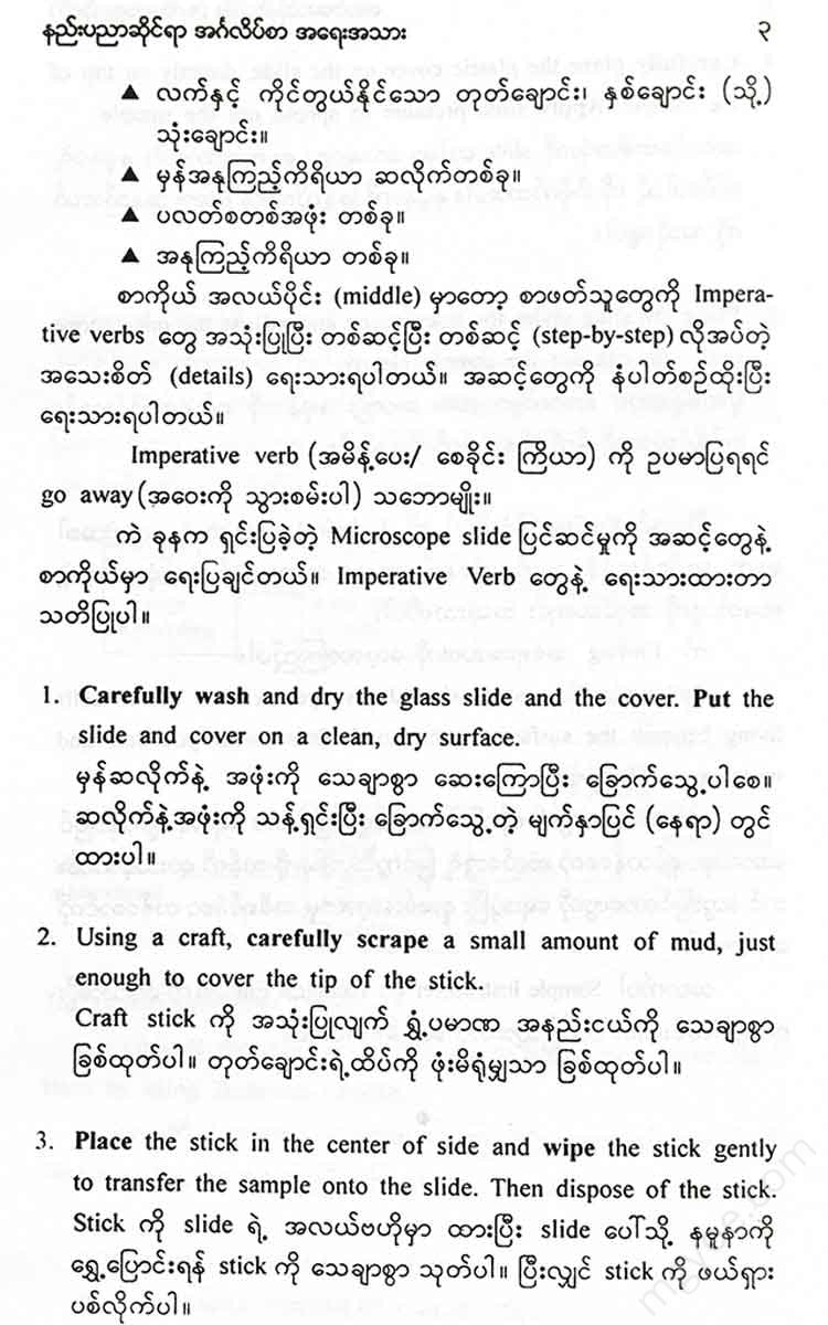 ကဲ ခုနက ရှင်းပြခဲ့တဲ့ Microscope slide ပြင်ဆင်မှုကို အဆင့်တွေနဲ့ စာကိုယ်မှာ ရေးပြချင်တယ်။ Imperative Verb တွေနဲ့ ရေးသားထားတာ သတိပြုပါ။